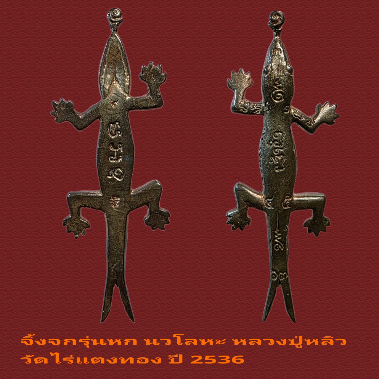 ร้านขอแนะนำ จิ้งจกรุ่นหก เนื้อนวโลหะ หลวงปู่หลิว วัดไร่แตงทอง จ.นครปฐม ปี2536 ตอก2โค๊ต สภาพสวยสมบูรณ์มากผิวกลับดำ จิ้งจกรุ่นนี้ถือเป็นรุ่นยอดนิยม เพราะถือว่าสร้างในปีเดียวกับเหรียญพญาเต่าเรือน”รุ่นปลดหนี้”อันโด่งดังมีโค้ดตอก 2 ตัวทำให้เล่นง่าย จิ้งจกสองหางในตำนาน จิ้งจกเป็นสัตว์ประจำคู่บ้านเรือนที่อยู่อาศัยออกหากินแมลงตามที่มีแสงสว่างเช่นหลอดไฟ มักส่งเสียงร้อง จนเป็นความเชื่อของคนโบราณว่าถ้าจิ้งจกร้องทักจะเกิดเหตุการณ์ดีหรือร้าย จนมีบันทึกไว้ในตำราความเชื่อเรื่องโชคลาง แต่จิ้งจกหากมีสองหางแล้วโบราณถือว่าเป็นสัตว์นำโชค เชื่อกันว่าหากบ้านใดมีจิ้งจกสองหางแล้วจะมีโชคมีลาภ ทำมาค้าคล่องเงินทองไหลมาเทมา คาถาบูชาจิ้งจกสองหาง