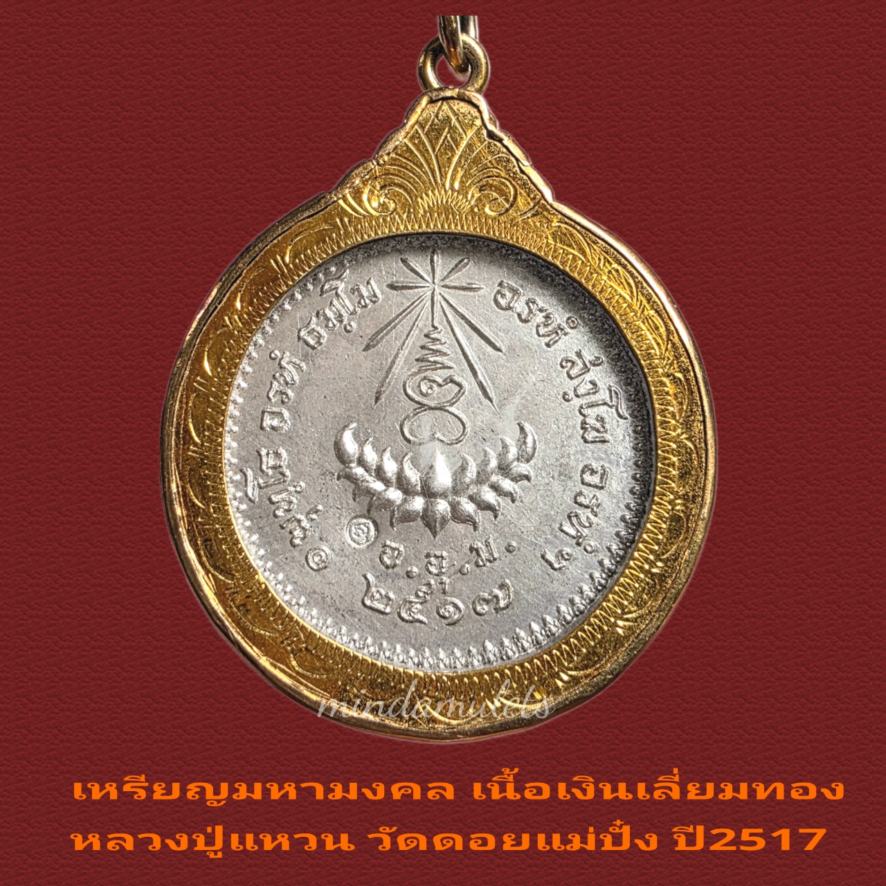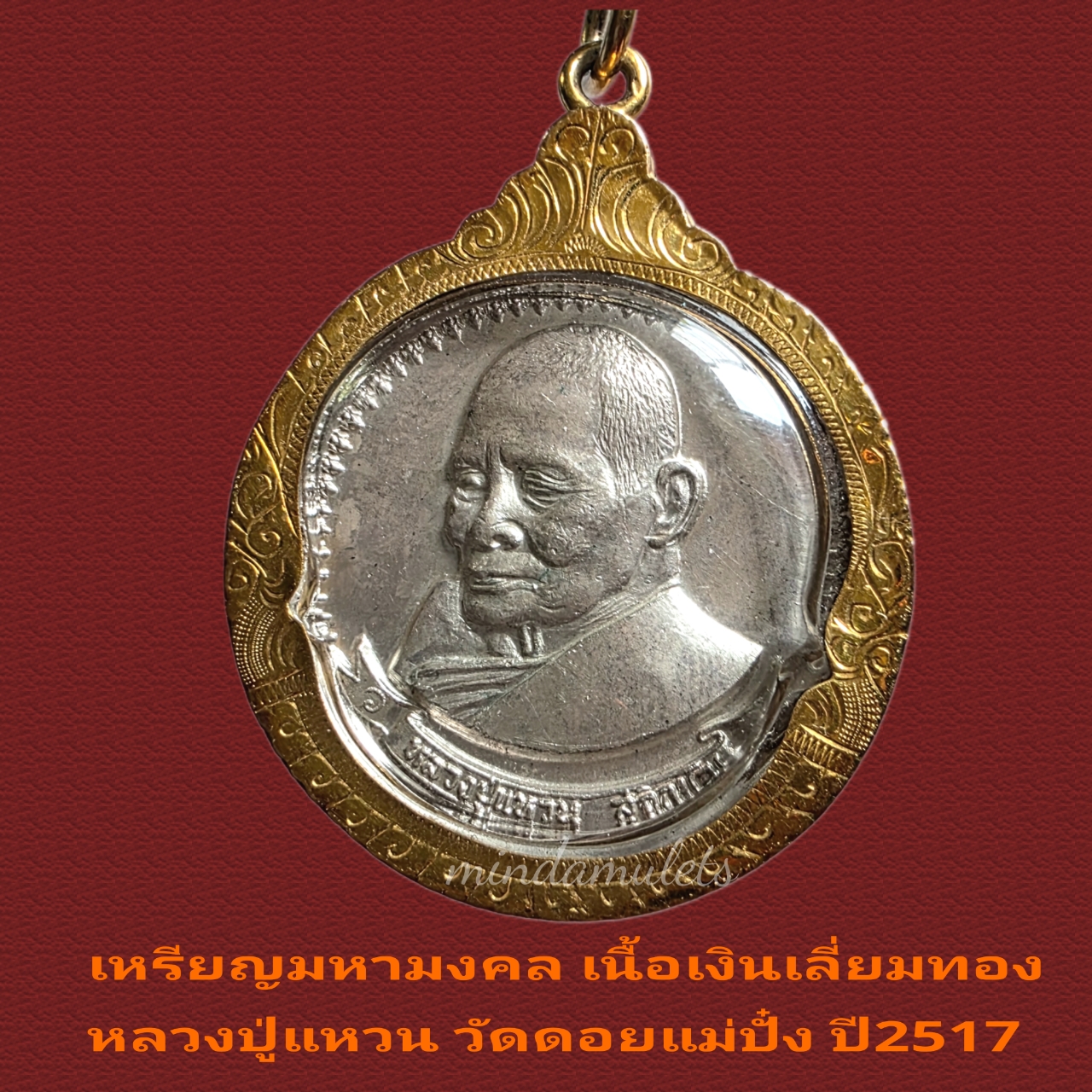 ร้านขอเสนอ เหรียญมหามงคล พิมพ์ใหญ่ เนื้อเงิน หลวงปู่แหวน วัดดอยแม่ปั๋ง เชียงใหม่ ปี2517 เลี่ยมทองแท้งานสั่งทำไม่ใช่กรอบสำเร็จรูป ตัวกรอบแท้น้ำหนักสองสลึงกว่า เหรียญเนื้อเงิน พิมพ์ใหญ่มีตอกโค้ด1ตัวด้านหลัง จัดสร้างโดยวัดสัมพันธวงศ์ โดยพระครูชินเทพ พิมพ์ใหญ่เนื้อเงินมีสร้าง 2000เหรียญ มีตอกโค้ด หายาก มีพิธีพุทธาภิเษกหมู่โดยพระกรรมฐานในสมัยนั้นมาร่วมงานหลายองค์ครับ เหรียญรุ่นนี้น่าเก็บสะสมหรือบูชามาก เป็นพระดีมีอนาคตแน่นอน โดยเฉพาะผู้จัดสร้างมีเจตนาดี จำนวนสร้างชัดเจน ไม่มีเสริม เหรียญรุ่นนี้เป็นเหรียญหลักรุ่นนิยมของสายหลวงปู่แหวนที่ได้รับความนิยมมาก