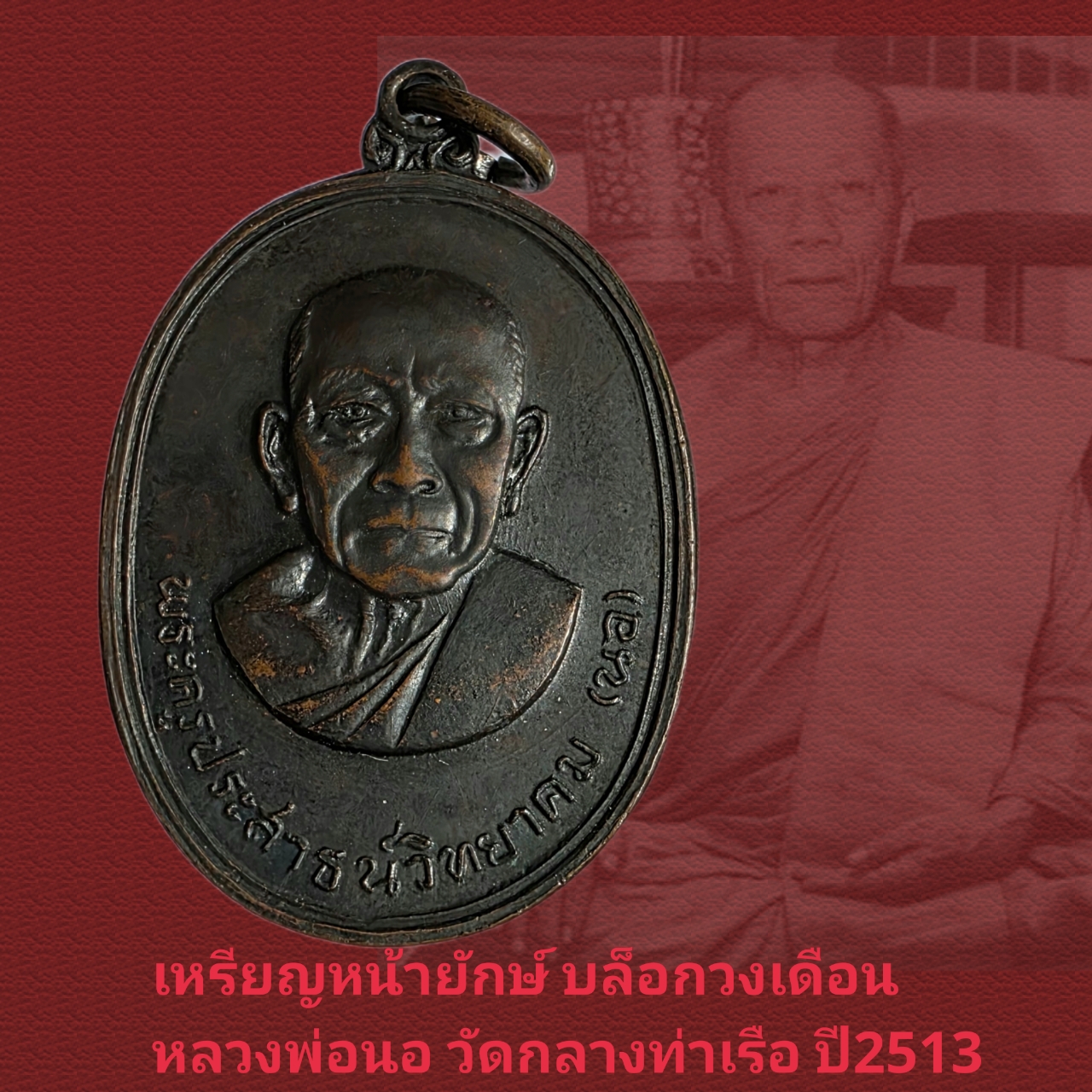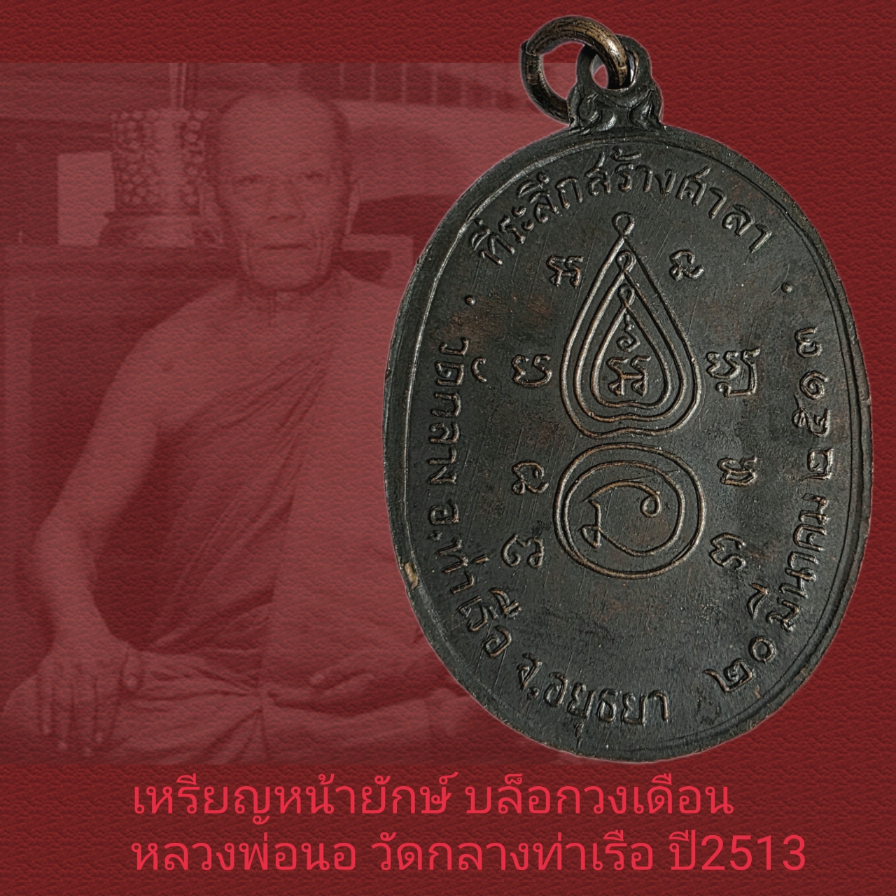 เหรียญหน้ายักษ์รมดำ บล็อกวงเดือน หลวงพ่อนอ วัดกลางท่าเรือ อยุธยา ปี2513